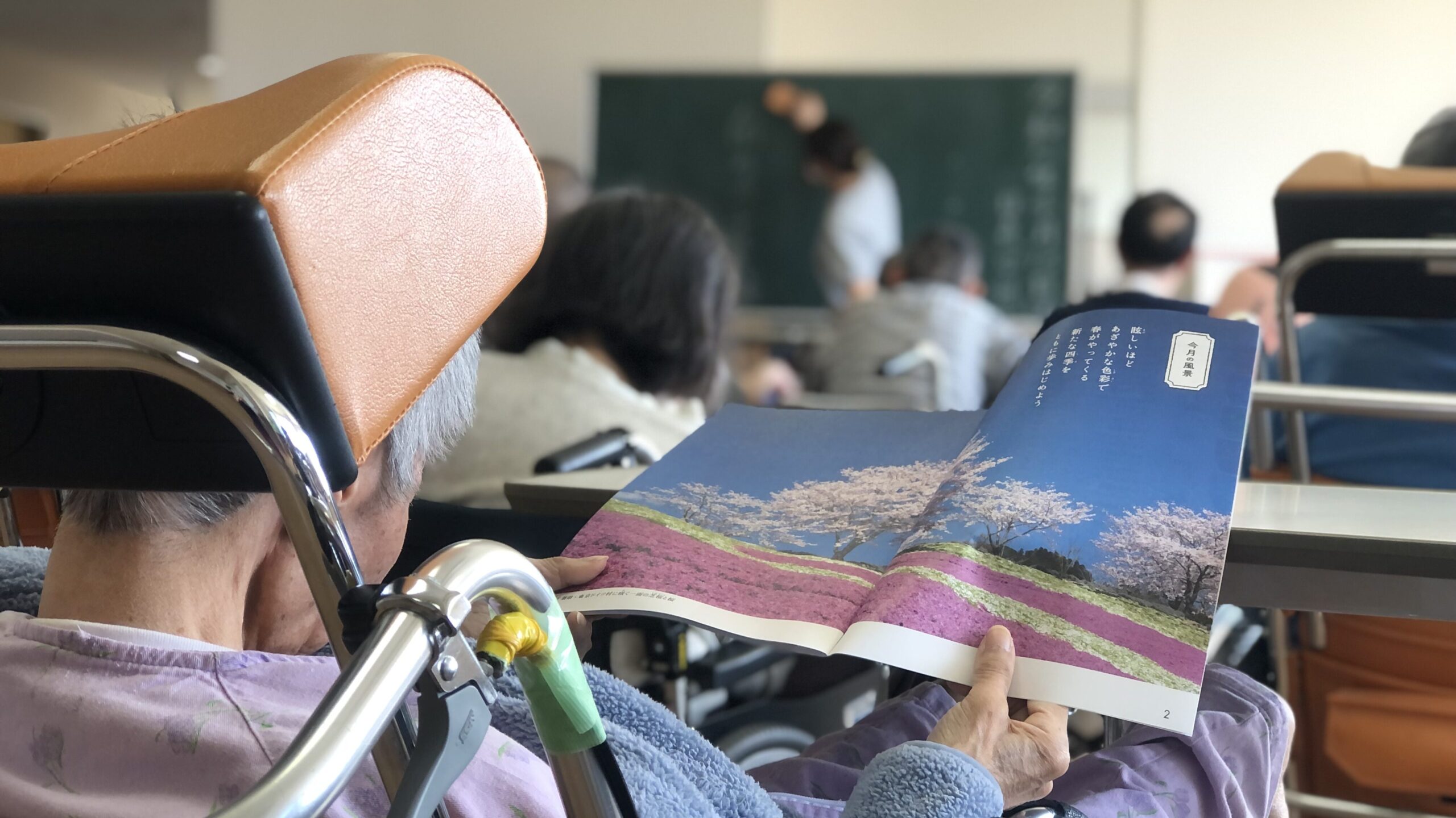 おとなの学校:認知症を対象に開発されたツール(教科書)を使用し、学校形式の様々なプログラムを楽しく行なっています。