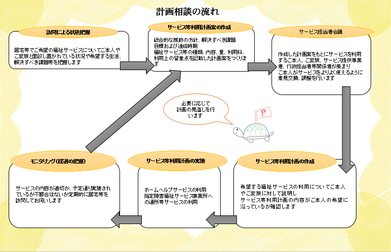 相談支援専門員が障がい福祉サービスの利用を希望する方に対して、サービス等利用計画を作成、利用の調整、定期的にモニタリング(計画の見直し)を行います。